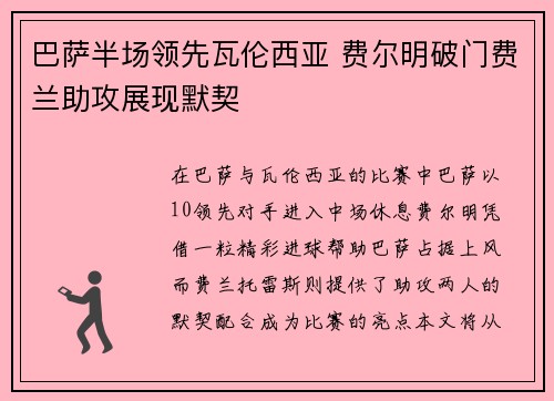 本文将详细分析巴萨客场力克瓦伦西亚并收获胜利的过程,尤其是梅开二度的费尔明当选最佳球员的精彩表现。文章将从四个方面进行阐述,首先从比赛的总体情况入手,再分别从费尔明的个人表现、巴萨的整体战术、以及瓦伦西亚的表现和失利原因来分析比赛的关键要素。最后,文章将总结巴萨此次胜利的意义以及未来的展望,尤其是费尔明在球队中的角色和价值。整个比赛过程体现了巴萨在关键时刻的韧性和球员的个人能力的完美结合。1、比赛...